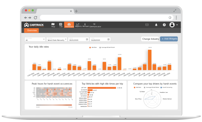 Cartrack’s Dashboards allow users to quickly and easily interpret the data from the vehicle tracking device.